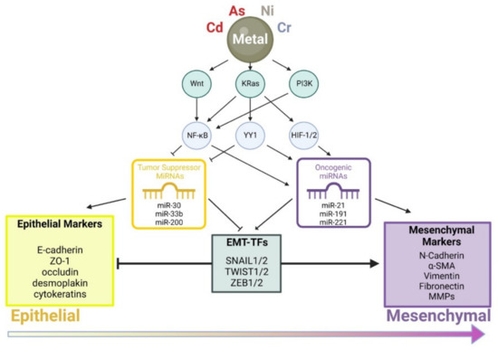 - Wu, C.-H.; Tang, S.-C.; Wang, P.-H.; Lee, H.; Ko, J.-L. Nickel-Induced Epithelial-Mesenchymal Transition by Reactive Oxygen Species Generation and E-Cadherin Promoter Hypermethylation. J. Biol. Chem. 2012, 287, 25292–25302. [Google Scholar] [CrossRef]
