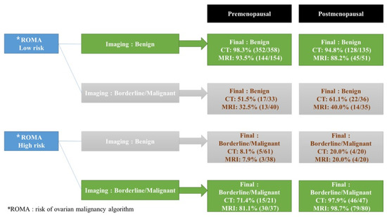 A total of 561 cases (379 (79.1%) premenopausal and 182 (75.5%) postmenopausal) and 322 cases (191 (69.4%) premenopausal and 131 (68.9%) postmenopausal) were consistent with ROMA and imaging in the CT (720 patients) and MRI groups (465 patients), respectively (Table 2).