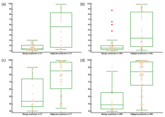 (a) ROMA values (median, 14.6; range, 11.4–30.8) in premenopausal patients with benign prediction of imaging were higher than those (median, 56.4; range, 12.9–99.5) in premenopausal patients with malignant predictions in the CT group (p < 0.0001). (b) ROMA values (median, 15.6; range, 11.4–87.9) in premenopausal patients with benign prediction of imaging were higher than those (median, 34.6; range, 11.6–99.5) in premenopausal patients with malignant predictions in the MRI group (p < 0.0001). (c) ROMA values (median, 43.9; range, 30.6–90.3) in postmenopausal patients with a benign prediction of imaging were higher than those (median, 85.5; range, 34.2–99.7) in postmenopausal patients with malignant predictions in the CT group (p = 0.0001). (d) ROMA values (median, 39.0; range, 30.1–90.3) in postmenopausal patients with a benign prediction of imaging were higher than those (median, 84.5; range, 31.7–99.7) in postmenopausal patients with malignant predictions in the MRI group (p < 0.0001). All data was displayed on the boxplot by yellow circle dots. The values above the upper quartile plus three times the interquartile range were represented by a red square dot on the boxplot.