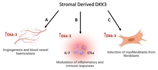 Dkk-3 contributes to several biological processes that implicate a role in cell and tissue differentiation. These include the maintenance of cartilage [11], endothelial regeneration [12], and the induction of myofibroblasts from fibroblasts (Figure 1) [13]. In addition, Dkk-3 has been reported to be involved in the differentiation of induced pluripotent and embryonic stem cells [12]. Although Dkk-3 inhibits cancer cell proliferation [14,15,16], its function in stromal cells, particularly in a cancer setting, is less clear. One aim of this review is to highlight the potential role of Dkk-3, and in particular, stromal Dkk-3, as a component of the tumor microenvironment. Some of the roles of Dkk-3 in cancer are summarized in Table 1.