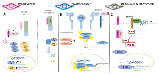 An association between Dkk-3 and tumor stroma has been reported in ER-negative breast cancer, ovarian cancer, and colon cancer cells [17], where DKK3 gene expression is upregulated in the tumor stroma, correlating with a more aggressive tumor type [17]. Heat shock factor-1 (HSF-1) was found to regulate DKK3 gene expression in stromal cells as part of the response to stress including oxidative stress, nutrient deprivation, and protein misfolding. This study further reported that stromal Dkk-3 enhances pro-tumorigenic signaling by activating YAP/TAZ (Figure 3A) [17].