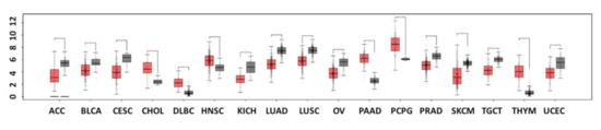 Differential DKK3 expression in cancer versus normal cells using RNA-Seq analysis of 9736 tumors and 8587 normal samples from TCGA and GTEx. ACC; Adrenocortical carcinoma (num(T) = 77; num(N) = 128), BLCA; Bladder Urothelial Carcinoma (num(T) = 404; num(N) = 28), CESC; Cervical squamous cell carcinoma and endocervical (num(T) = 306; num(N) = 13), CHOL; Cholangiocarcinoma (num(T) = 36; num(N) = 9), DLBC; (num(T) = 47; num(N) = 337), HNSC; Head and Neck squamous cell carcinoma (num(T) = 519; num(N) = 44), KICH; Kidney Chromophobe (num(T) = 66; num(N) = 53), LUAD; Lung adenocarcinoma (num(T) = 483; num(N) = 347), LUSC; Lung squamous cell carcinoma (num(T) = 486; num(N) = 338), OV; Ovarian serous cystadenocarcinoma (num(T) = 426; num(N) = 88), PAAD; Pheochromocytoma and Paraganglioma Thymoma (num(T) = 179; num(N) = 171), PCPG; (num(T) = 182; num(N) = 3), PRAD; Prostate adenocarcinoma (num(T) = 492; num(N) = 152), SKCM; Skin Cutaneous Melanoma (num(T) = 461; num(N) = 558), TGCT; Testicular Germ Cell Tumors (num(T) = 137; num(N) = 165), THYM; Thyroid carcinoma (num(T) = 118; num(N) = 339), UCEC; Uterine Corpus Endometrial Carcinoma (num(T) = 174; num(N) = 91). The data were prepared using http://gepia.cancer-pku.cn (accessed on 10 September 2022).