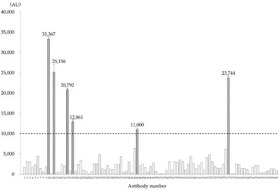 Measurement of fluorescence intensity of the 95 clones prepared by the fourth screening of the secondary human multicentric osteosarcoma (HMOS-P) using fluorescence probe-based enzyme-linked immunosorbent assay (ELISA). Among these, six clones showed a fluorescence intensity ≥ 10,000 arbitrary units (AU).