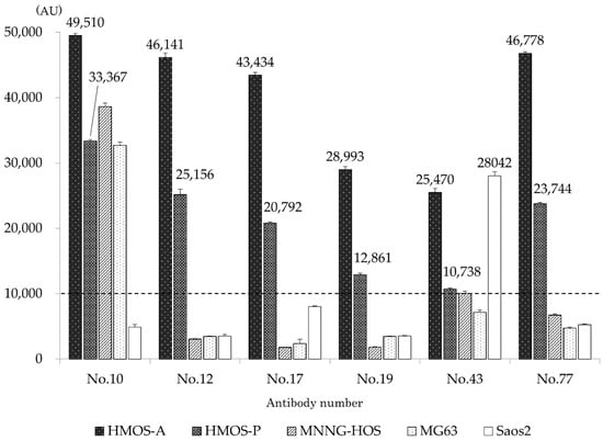 Among the generated antibody clones recognizing 95 independent antigens, antibody numbers 10, 12, 17, 19, 43, and 77 exhibited a fluorescence intensity ≥ 10,000 AU with HMOS-P and were therefore judged as positive (Figure 1). Antibody reactions using the ELISA method were performed on all cell types using the six antibodies (Figure 2). All antibodies exhibited stronger fluorescence intensity, indicating greater reactivity with HMOS-A than with HMOS-P. Antibody number 10 was positive for all cells except for Saos2 cells. Antibody numbers 12, 17, 19, and 77 were positive only for HMOS-A and HMOS-P, and the fluorescence intensity was less than 10,000 AU in the other HOS cell lines. Antibody number 43 was positive for HMOS-A, HMOS-P, and Saos2. The cell lines tested negative for mycoplasma infection.