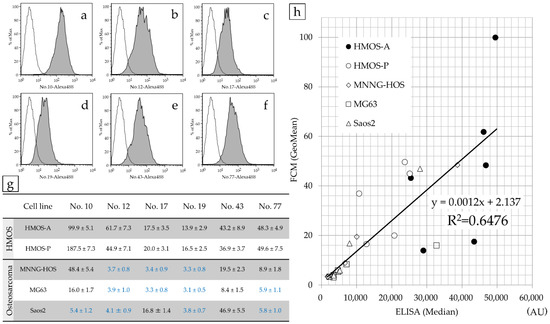 Correlation between ELISA-based and FCM fluorescence intensities at HMOS-P. FCM histograms of antibody numbers 10 (a), 12 (b), 17 (c), 19 (d), 43 (e), and 77 (f) incubated with HMOS-P. The FCM fluorescence intensity (GeoMean) for all cell lines was investigated. According to the results of flow cytometry of the HOS cell lines, most antibodies against antibody numbers 12, 17, 19, and 77 were negative (the values highlighted in blue were judged to be negative). In the HMOS cell line, most cells of antibody numbers 12, 43, and 77 were positive (g). The correlation between ELISA fluorescence intensity (median) and FCM fluorescence intensity (GeoMean) for all cell lines was strong. The correlation coefficient was r = 0.805 (h).