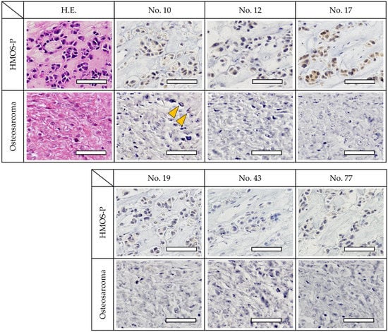 Immunohistochemistry of cancer tissues. Staining of similar paraffin sections of HMOS (upper row) and HOS (lower row). The cell lines exhibited strong positive staining with antibody numbers 10, 12, 17, and 77. The staining was also positive for antibody numbers 19 and 43 but relatively weaker. Immunohistochemical staining shows positive cells (yellow arrowheads). These results were comparable to those of the ELISA fluorescence intensity. Scale bar, 50 μm.
