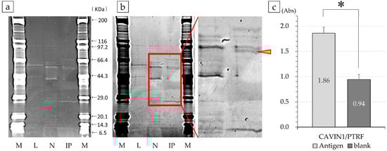 SDS-PAGE of the antigen–antibody complex and confirmation analysis with purified protein. Using immunoprecipitation through magnetic beads, the band incubated separately with the antibody was detected. Number 12 (a); M, marker; L, cell lysate solution; N, negative; IP, positive samples recovered by immunoprecipitation. Figure 5a is inverted in black and white and shows an enlarged view of more specific bands. This band (yellow arrowhead) was analyzed by Liquid chromatography-mass spectrometry (LC/MS) (b). The reactivity of commercially available CAVIN1/PTRF with antibody number 12 was confirmed. The protein had a stronger reactivity with the purified protein compared to that with the negative control, suggesting the occurrence of an antigen–antibody reaction (* p < 0.001) (c).