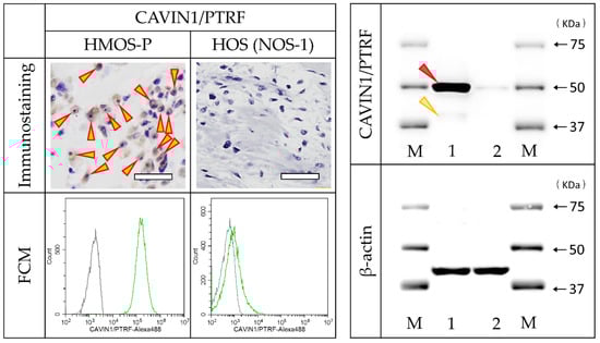 Immunostaining, FCM, and Western blot (WB) as a validation experiment for CAVIN1/PTRF. Tissue immunostaining of HMOS and HOS (upper row, red/yellow arrowheads indicate positive cells) and FCM of HMOS-P and NOS-1 cells (lower row) using the commercial antibody for CAVIN1/PTRF. The WB analysis result showed a specific and strong band (red arrowhead) of CAVIN1/PTRF. A very weak band at approximately 43 kDa, as calculated molecular weight, was also detected (yellow arrowhead). M, marker; 1, cell lysate of HMOS-P solution; 2, cell lysate of HOS solution. Scale bar = 50 μm.