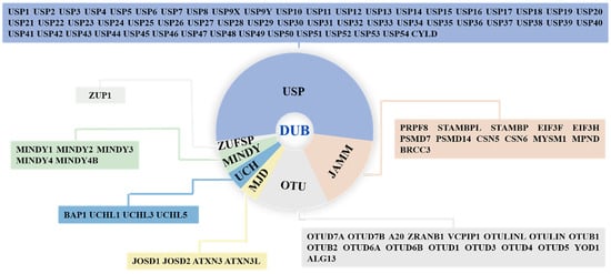 Deubiquitinases (DUBs) are isopeptidases that can cleave a single ubiquitin or entire ubiquitin chains from target proteins, thereby counteracting protein ubiquitylation, a post-translational modification fundamental for the regulation of protein stability, activity, subcellular localization, and interactions [,]. DUBs are involved in many physiological processes, such as apoptosis, autophagy, and the cell cycle, and pathological processes, such as neurodegenerative diseases and cancers [,,,,,]. Hence, DUBs have attracted attention as therapeutic targets, and DUB inhibitors have been developed, with some now in preclinical development or clinical trials []. To date, approximately 100 DUBs have been reported and are classified into seven subfamilies based on their sequence and structural similarities as follows: ubiquitin-specific proteases (USPs), ubiquitin carboxy-terminal hydrolases (UCHs), ovarian tumor proteases (OTUs), Jab1/MPN domain-associated metalloenzymes (JAMMs), Machado–Joseph disease proteases (MJDs), the monocyte chemotactic protein-induced protease family (MINDYs), and Zn-finger and UFSP domain proteins (ZUFSPs) (Figure 1) [].