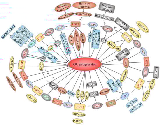 USPs constitute the largest family of human DUBs, with 56 members. As shown in Figure 2, at least 25 USPs are linked to GC.