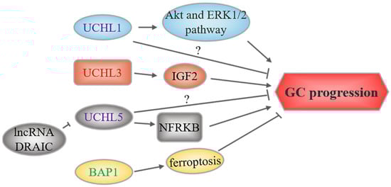 All members of this family have been reported to be associated with GC (Figure 3). UCHL1, also called PGP9.5, controls intracellular ubiquitin levels and is related to tumorigenesis in various cancer types []. However, UCHL1 has a paradoxical role in GC. UCHL1 promoter hypermethylation is a common event in several types of primary digestive tumors, including GC [,,,,]. Moreover, UCHL1 hypermethylation is more frequent in advanced-stage GC [,]. In addition, this hypermethylation is associated with poor prognosis []. Furthermore, galangin cytotoxicity in SNU-484 cells may occur through increasing UCHL1 levels []. These studies indicate that UCHL1 may serve as a tumor suppressor and a diagnostic marker for GC. However, two other studies reported higher UCHL1 expression in liver metastases from GC and gastric cardiac adenocarcinoma, likely because UCHL1 overexpression increases the proliferation, migration, and invasion capabilities of GC cells [,]. Lastly, the pro-cancer effect of UCHL1 is mechanistically correlated with activated Akt and ERK1/2 pathways []. Thus, the role of UCHL1 in GC requires further investigation.