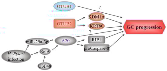 Three members of this family, including OTUB1, OTUB2, and A20, have been linked to GC (Figure 4). Weng et al. found that patients with GC with high OTUB1 expression were associated with several advanced clinical features, such as invasion depth, lymph node status, and nerve invasion, and these patients had lower disease-specific survival rates. OTUB1 was found to be active in GC cell invasion and migration [], but the underlying mechanism is unknown. Similar to OTUB1, OTUB2 was also found to be overexpressed in GC tissues and cell lines and predicted a poor prognosis [,]. Silencing OTUB2 inhibited GC cell growth, metastasis, and sphere formation. Mechanistically, OTUB2 acts as a potential driver oncogene in GC by deubiquitinating and stabilizing the demethylase KDM1A, and epithelial keratin KRT80 [,]. As previously reported, KDM1A and KRT80 contributed to GC progression by regulating KLF2 expression and the PI3K/Akt pathway, respectively [,].