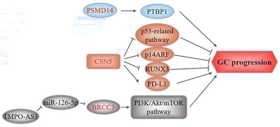 CSN5, the catalytic subunit of the COP9 signalosome, also called COPS5 or JAB1, may play a role in GC []. CSN5 overexpression contributes to GC by modulating the stability or expression of several tumorigenic proteins. Silencing CSN5 suppresses GC cell growth and induces apoptosis by regulating P53 and BAX expression []. Additionally, CSN5 induces non-ubiquitin proteasomal degradation of the tumor suppressor p14ARF []. CSN5 also facilitates the nuclear export and degradation of the tumor suppressor RUNX3 []. Previous studies suggested that TNFα and CCL5 increase CSN5, stabilize PD-L1, and facilitate the immune escape of breast cancer cells and colorectal cancer cells [,]. CSN5 also stabilizes PD-L1 in GC cells. Furthermore, CSN5 activity in GC cells is regulated by the DAPK1/IKKβ axis []. Collectively, these studies indicate that CSN5 could be a novel therapeutic target in GC.