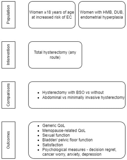 Oxley, S.; Xiong, R.; Wei, X.; Kalra, A.; Sideris, M.; Legood, R.; Manchanda, R. Quality of Life after Risk-Reducing Hysterectomy for Endometrial Cancer Prevention: A Systematic Review. Cancers 2022, 14, 5832. https://doi.org/10.3390/cancers14235832