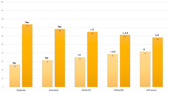 At the moment of the last administration of the ICI, 73.7% of patients complained of dyspnea, 68.4% had anorexia, and 71.1% had an ECOG PS ≥ 2 (Figure 1).
