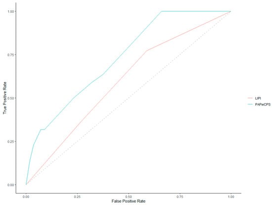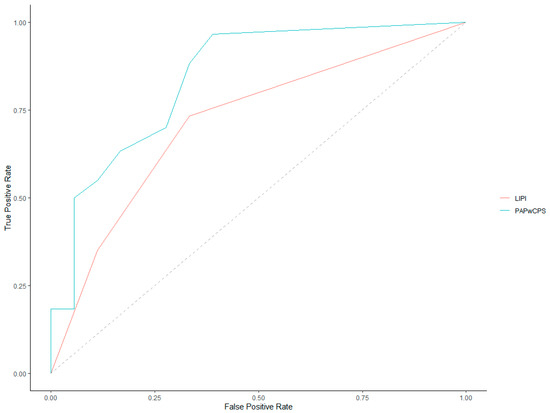 Investigating the 90-day mortality, the AUC of the ROC curves was 0.71 (95% CI, 0.59–0.84) for LIPI and 0.84 (95% CI, 0.72–0.95) for PaPwCPS. The latter was found to be significantly more accurate, comparing the AUC of the ROC curves (p = 0.03).