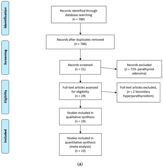 Patients from the literature were retrieved as follows: The NIH database PubMed (http://www.ncbi.nlm.nih.gov/sites/entrez; accessed on 30 June 2022) was searched using the search terms ‘ectopic’ and ‘parathyroid’ and ‘cancer’ or ‘carcinoma’. The search identified 786 articles. The PRISM diagram (Figure 1a) provides detail. The NIH database PubMed (http://www.ncbi.nlm.nih.gov/sites/entrez, accessed on 30 June 2022) was also searched using the search terms “parathyroid ectopic” and “parathyroid mediastinal” to identify mediastinal parathyroid adenomas. The search identified 2337 publications. The PRISM diagram (Figure 1b and Supplementary Datasheet S1) provides detail.
