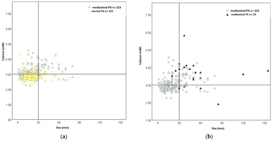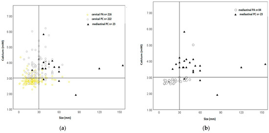 Scatter plot of calcium levels versus tumour size of benign (a) and malignant (b) mediastinal parathyroid neoplasms. Legend to (a) (left) cervical parathyroid adenomas been obtained from Schulte and Talat [12] and 223 mediastinal parathyroid adenomas were obtained from case reports from the literature. (b) (right), the cohort of 23 mediastinal parathyroid cancer patients corresponds to the patients in Supplementary Table S1.