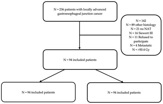 - Lorenzen, S.; Biederstadt, A.; Ronellenfitsch, U.; Reissfelder, C.; Monig, S.; Wenz, F.; Pauligk, C.; Walker, M.; Al-Batran, S.E.; Haller, B.; et al. RACE-trial: Neoadjuvant radiochemotherapy versus chemotherapy for patients with locally advanced, potentially resectable adenocarcinoma of the gastroesophageal junction—A randomized phase III joint study of the AIO, ARO and DGAV. BMC Cancer 2020, 20, 886. [Google Scholar] [CrossRef]