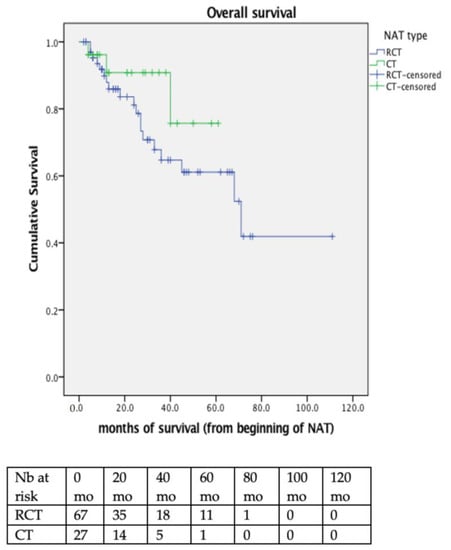 Overall survival (OS) for all patients, according to their treatment group. RCT patients had a median OS of 71 months (95%CI 37.5–104.4) whereas median OS was not reached in the CT group. 3-year OS was 78.6% in RCT and 75.7% in CT patients (p = 0.259). NAT = neoadjuvant treatment; RCT = radio-chemotherapy; CT = chemotherapy.