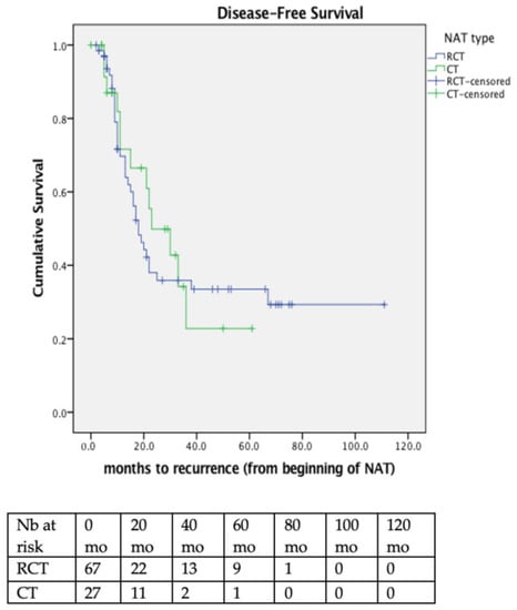Disease-free survival (DFS) for all patients, according to their treatment group. Median DFS was 18 months (95%CI 13.6–22.5) in RCT and 23 months (95%CI 8.9–37.1) in CT patients. Respective 3-year DFS was 35.9% and 22.8% (p = 0.763). NAT = Neoadjuvant treatment; RCT = radio-chemotherapy; CT = chemotherapy.