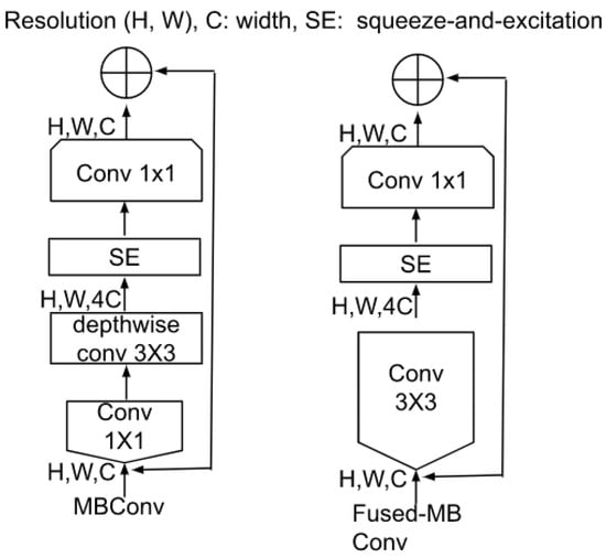 - Convolutions and their building blocks: The EfficientNetV2 models use various types of convolutions, mainly Fused-MB Conv instead of MB Conv. The detailed architecture information of Fused-MB Conv and MB Conv is shown in Figure 2.