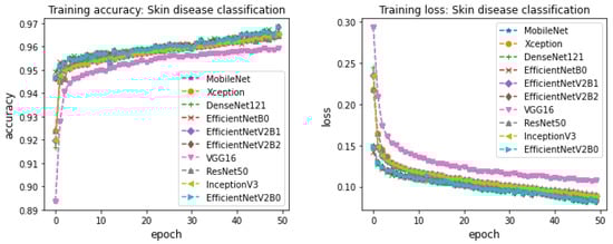 CNN-based pretrained models were trained on skin disease detection and skin disease classification. The CNN-based pretrained models considered in this work are Xception, VGG16, MobileNet, ResNet50, InceptionV3, DenseNet121, EfficientNetB0, EfficientNetV2B0, EfficientNetV2B1, and EfficientNetV2B2. These models contain several network parameters and network structures. The optimal performance depends on these network parameters and network structures. To find the best parameters for the network, various trials of experiments were run for the parameters’ optimizer, learning rate, epochs, and batch size. During training, the data samples in training and validation sets are shuffled to avoid bias in the training of a model. The optimal parameters for learning rate, epochs, batch size, and optimizer were 0.001, 50, 64, and adam, respectively. Various trials of experiments were run for optimizers such as adam, sgd, Adagrad, Adamax, and Nadam. The experiments with adam demonstrated successive improvement in training accuracy and validation accuracy and successive decrement in training loss and validation loss across epochs. Based on this, the optimizer parameter value is set to adam for the rest of the experiments. Next, to identify the optimal learning rate, the experiments were run for the learning rate in the range of 0.0001–0.5. The experiment with 0.001 demonstrated better training accuracy, validation accuracy, training loss, and validation loss during training. Thus, the learning rate is set to 0.001. To find the optimal parameters for batch size, the experiments were run for batches 32, 64, and 128. Due to limited access to memory, the batch size was not increased after 128. The experiments with 64 and 128 were almost similar in training accuracy and validation accuracy across epochs. Thus, the batch size is set to 64. Though batch size 128 slightly shows better performances for training accuracy and training loss, the batch size is set to 64. Because some of the CNN-based pretrained models result in memory issues, to find out the best parameter for epochs, the experiments were run for 70 epochs. However, all the models have not demonstrated any successive improvement in training accuracy and successive decrease in training loss after 50 epochs. Thus, we decided to set 50 epochs as optimal for the training of a model to detect skin diseases and classify them into the skin disease family. The training accuracy and training loss for the CNN-based pretrained models across 50 epochs for skin disease detection is shown in Figure 5. Figure 6 shows the training accuracy and training loss for the CNN-based pretrained models for skin disease classification. The models belonging to the EfficientNetV2 family demonstrated better accuracy by showing successive improvement in training accuracy and successive decrement in training loss compared to other CNN-based pretrained models in both skin disease detection and skin disease classification. Though the other models attained closer performance of training accuracy and training loss as EfficientNetV2, most of the models other than EfficientNetV2 did not show the same performance during testing. This is mainly due to the reason that most of the models other than EfficientNetV2 have reached the phase of overfitting and the models were not able to discriminate well among classes during testing for the new variants of skin disease images. VGG16 and MobileNet models demonstrated less performance in training accuracy and training loss compared to other CNN-based pretrained models in both skin disease detection and skin disease classification. Xception, DensNet121, ResNet50, and InceptionV3 models’ performance in terms of training accuracy and training loss were almost similar across epochs 50 but less compared to the models of a family of EfficientNet in both skin disease detection and skin disease classification. For skin disease detection, most of the models have demonstrated above 96% training accuracy and less than 0.1 training loss. EfficientNet models have reached above 99% training accuracy and less than 0.001 training loss for skin disease detection at the end of epochs 50. Most of the models have reached an accuracy of 95% and loss of less than 1 by epochs in the range of 15–20 for skin disease detection. The experiments were run to 50 epochs because the models have demonstrated successive improvement in training accuracy and training loss after 20 epochs. Similar performances were demonstrated by the CNN-based pretrained models for skin disease classification. In particular, the family of EfficientNet models has achieved 99% training accuracy with less than 0.01 training loss for skin disease classification. Most of the CNN-based models have demonstrated above 95% training accuracy and less than 0.1 training loss at epochs in the range 20–25. The experiments were continued until epoch 50 because the model has demonstrated a little successive improvement after epoch 25.