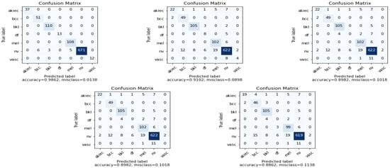 The confusion matrix for the CNN-based pretrained model for skin disease classification is shown in Figure 7. The proposed model showed a 0.0138 misclassification rate, which is less compared to all the CNN-based pretrained models. The misclassification rate of EfficientNetB0, EfficientNetV2B0, EfficientNetV2B1, and EfficientNetV2B2 are 0.09, 0.07, 0.06, and 0.04, respectively. Models such as ResNet50, InceptionV3, and DenseNet121 showed a high misclassification rate compared to the models of a family of EfficientNet. The high misclassification shown by the models Xception, VGG16, and MobileNet is compared to all the other CNN-based pretrained models in skin disease classification. The proposed approach classified all the samples of Actinic keratoses, Basal cell carcinoma, Benign keratosis-like lesions, Dermatofibroma, Melanoma, and Vascular lesions. For Melanocytic nevi, the proposed model misclassified six samples as Basal cell carcinoma, three samples as Benign keratosis-like lesions, and five samples as Melanoma. Most importantly, except the proposed models, the other existing models have shown a high misclassification rate for rare skin diseases such as Vascular lesions and Dermatofibroma. The models such as ResNet50, InceptionV3, VGG16, MobileNet, Xception, and DenseNet121 have failed to classify a single sample correctly for Vascular lesions and Dermatofibroma. This indicates that these models are not effective in highly imbalanced skin disease datasets. Though these models are effective in other classes and demonstrated accuracy above 85%, the existing models are not effective for rare skin diseases in both skin disease detection and skin disease classification. In addition to rare skin diseases, the models other than the proposed approach and a family of EfficientNet showed a high misclassification rate. Since the proposed approach is a fused model of a family of EfficientNetV2, it outperformed a single-finetuned EfficientNetV2 model and EfficientNet model in both skin disease detection and skin disease classification. Overall, the proposed model has demonstrated less misclassification rate for all the classes in skin disease classification compared to other CNN-based pretrained models.