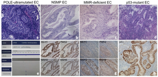 Histological sections of endometrioid carcinoma and typical features of molecular subgroups (a–d), Hematoxilyn-Eosin 20×): POLE-EC (a,e), NSMP-EC (a) mismatch repair-proficient ((f), immunostains), MMR-deficient EC (c) with absence of expression of MLH1 and PMS2 ((g), immunostains), p53-EC (d) with abnormal diffuse nuclear overexpression of p53 associated with TP53 mutation ((h), immunostains).