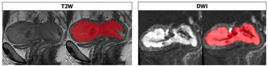 Segmentation performed on T2 and DWI sequences in the sagittal plane along the tumor boundary. The endometrial cavity is replaced by solid heteroplastic tissue characterized by intermediate signal intensity in the T2 sequences and high signal compared with the neighboring myometrium in the DWI images; the tumor is bounded by the red area as shown in the figure alongside both sequences as performed in the segmentation process, on the T2 and DWI.