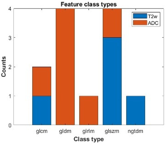 Statistically significant features which can individually separate between a low and a high/intermediate ESGO/ESTRO/ESP 2020 tumor classification. We report the number of statistically significant features after correction for multiple comparison divided by class types and modality. Blu refers to features obtained from T2w images; orange refers to features extracted from ADC maps. The features belong to the following class types: Gray Level Cooccurence Matrix (glcm), Gray Level Dependence Matrix (gldm), Gray Level Run Length Matrix (glrlm), Gray Level Size Zone Matrix (glszm), Neighbouring Gray Tone Difference Matrix (ngtdm).