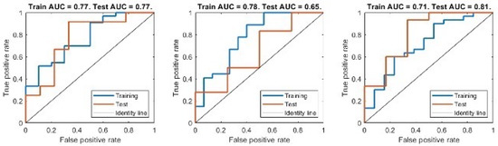Figure 5 shows the results obtained from the three-fold cross-validation approach. In each subplot, we report the training and test ROC curves obtained from training the best model on two subsets and testing on the remaining one. We found an AUC of 0.77, accuracy of 0.80, sensitivity of 0.82 and specificity of 0.5 for training set 1; an AUC of 0.78, accuracy of 0.76, sensitivity of 0.77 and specificity of 0.72 for training set 2; an AUC of 0.71, accuracy of 0.74, sensitivity of 0.75 and specificity of 0.66 for training set 3.