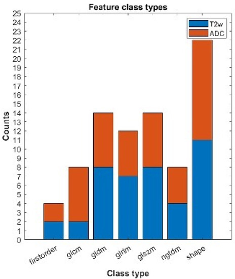 Figure 6 shows the feature class types of the 82 features that were found to be significantly different (p(FDR) < 0.05) between the group with LVSI and the group without it (T2w-derived = 40, ADC-derived = 42). The number of features decreased to 26 after removing those with high correlation.