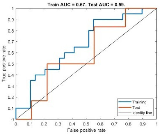 We found that the best-performing model under the AIC was a model consisting of a single predictor feature from ADC: Large Dependence Emphasis (LDE). Figure 7 shows the ROC curve obtained from training the best model with Group 1 data and testing on Group 2 (AUC of 0.67 for training and an AUC of 0.59 when testing). We found an AUC of 0.67, accuracy of 0.65, sensitivity of 0.60 and specificity of 0.67 for the training set and for the testing set an AUC of 0.59, accuracy of 0.60, sensitivity of 0.50 and specificity of 0.61. We report the confusion matrices of both training and testing sets in Table 7. We found that the predictor variable and the intercept parameters of the model were significantly different from zero (ppredicto < 0.01, pinterc < 0.05).
