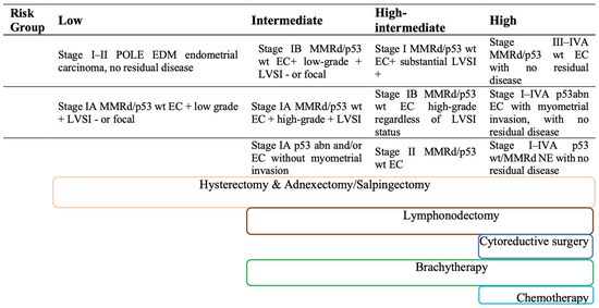 In order to provide therapeutic management guidelines, the ESMO-ESGO-ESTRO Consensus Conference 2016 stratified EC into four risk classes according to histology, grade, stage and the presence of LVSI, which should reflect tumor aggressiveness and the likelihood of recurrence directing toward possible adjuvant therapy [6].