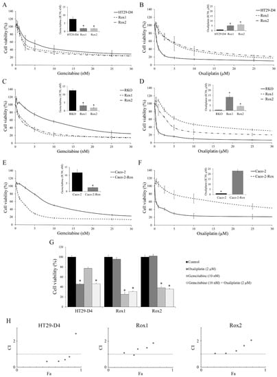 Very similar results were obtained with Caco-2 and Caco-2-Rox cells treated with gemcitabine, with IC50 values of 11.6 ± 2.0 nM for sensitive cells and 2.4 ± 0.5 nM for the resistant ones (p < 0.05, Figure 1E), while for oxaliplatin the IC50 values were 0.9 ± 0.2 µM for the sensitive cells and 23.1 ± 1.4 µM for the resistant ones (p < 0.05, Figure 1F).