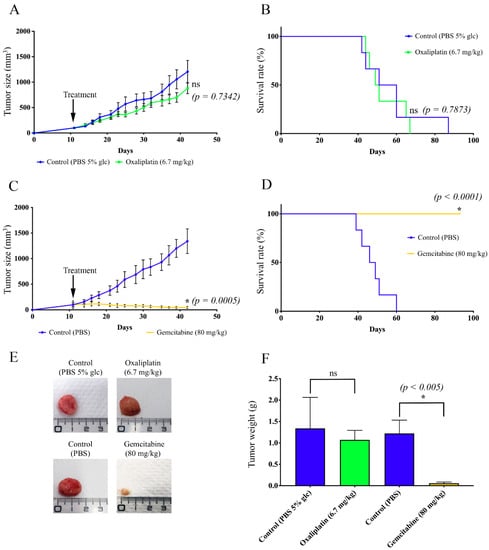 These data were corroborated by the sizes of the resected tumors. Indeed, tumors from gemcitabine-treated mice were significantly smaller and lighter than those from the control mice, while the treatment with oxaliplatin had no effect (Figure 2E,F).