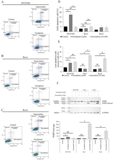Effects of gemcitabine on the induction of apoptosis. (A–C) Representative results of the flow cytometry analysis of annexin-V-FITC and propidium iodide staining (PI) for HT29-D4, Rox1, and Rox2 cells incubated for 48 hours in the presence of oxaliplatin or gemcitabine. (D,E) Proportion of cells in early and late apoptosis (expressed as percentages). The values presented are means ± standard errors (error bars) (n = 3). (F) Study of PARP cleavage in HT29-D4, Rox1, and Rox2 cells incubated in the absence or presence of 2 µM oxaliplatin or 2 nM gemcitabine. The Western blots were quantified, and the results are expressed as ratios (cleaved PARP/total PARP; 100% for control condition). Asterisks indicate statistical significance of p < 0.05, ns: not significant.