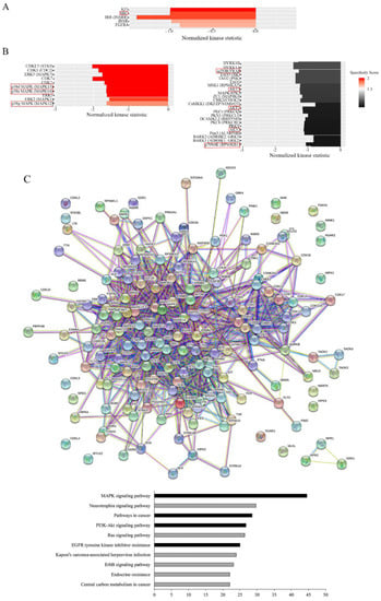 Effects of gemcitabine on kinase activity. HT29-D4 and Rox1 cells were seeded in 6-well plates and incubated in the presence of 10 nM gemcitabine for 4 hours. The cells were then lysed, and 0.5 µg of proteins were used for the PamGene kinase activity assay. The data were analyzed using the BioNavigator software to compare the kinase activities of the two cell types. The specificity scores were calculated by the PamGene BioNavigator software using six different databases. (A,B) Top kinase lists of PTK and STK analyses, respectively. A positive normalized kinase statistic value indicates a kinase activity higher in HT29-D4 cells than in Rox1 cells. (C) Interaction map fashioned with the String 11.0 program (https://string-db.org, accessed on 1 July 2020) showing the network nodes of all proteins analyzed with PTK and STK. The top pathway list of the interactome is also presented. Bar graphs show the -log of the false discovery rate obtained by the KEGG pathway. Black bar graphs represent the pathways of interest in cancer and drug response. (D–F) Interactomes of MAPK signaling, the PI3K-Akt signaling pathway, and EGFR tyrosine kinase inhibitor resistance, respectively. Different colored lines show the possible interactions between the nodes. The green, black, pink, red, and dark blue colors represent activation, reaction, post-translational modification, inhibition, and binding, respectively.