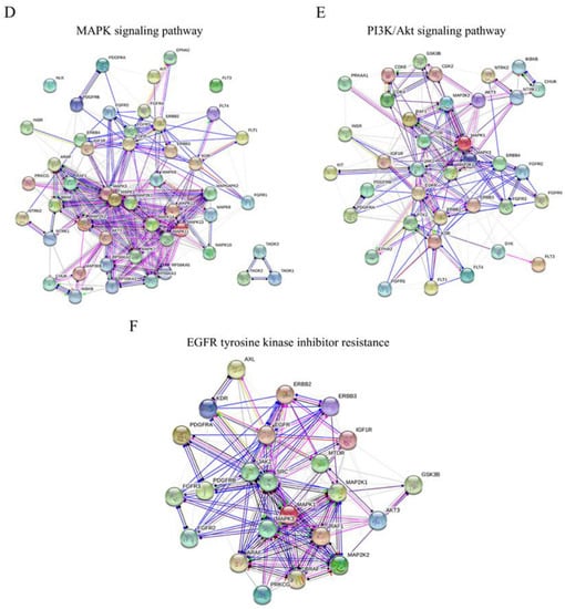 To visualize the gemcitabine response pathway, the protein–protein interactions among the different PTK or STK proteins were confronted using a string functional association network (Figure 4C). Three of them, the MAPK signaling pathway, the PI3K-Akt signaling pathway, and EGFR tyrosine inhibitor resistance, with log ratios of 44.5, 26.7, and 25, respectively, were selected and analyzed (Figure 4D–F). These analyses showed a strong implication of the MAPK and PI3K-Akt signaling pathways in the responses of resistant cells to gemcitabine.