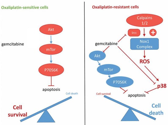 We had previously shown that p38 MAPK was responsible for this inhibition. We therefore studied the effects of gemcitabine on the kinome. Our data showed that gemcitabine inhibits both Src kinases and p38 MAPK. By inhibiting Src, gemcitabine could reduce the calpain-dependent Nox1 activity, thus decreasing the production of ROS and the activation of p38 MAPK. The inhibition of this kinase by gemcitabine may be responsible for the restoration of apoptosis. Our results also showed an inhibition of the Akt/mTor/p70S6 signaling pathway by gemcitabine. The Akt signaling pathway is well known to induce cell survival, and it is not surprising that gemcitabine inhibits this pathway. Moreover, the activation of Akt has already been shown to be involved in the resistance of tumor cells to gemcitabine [41,42,43]. A preclinical study was carried out with gemcitabine supplemented with an Akt inhibitor, LY2780301, to improve the efficiency of the chemotherapy [44]. This study was performed on several types of solid tumors. However, it only included two patients with colorectal cancer. Therefore, these data are not sufficient to be conclusive [44]. As several mutations of PI3K are observed in colorectal cancer, it would be interesting to test the efficiency of a combination treatment with gemcitabine and LY2780301 [45]. Akt and p38 MAPK signaling pathways are not only linked to oxaliplatin resistance, they were also shown to be strongly involved in the resistance to irinotecan and 5-FU in colorectal cancer [30,32,34,35].