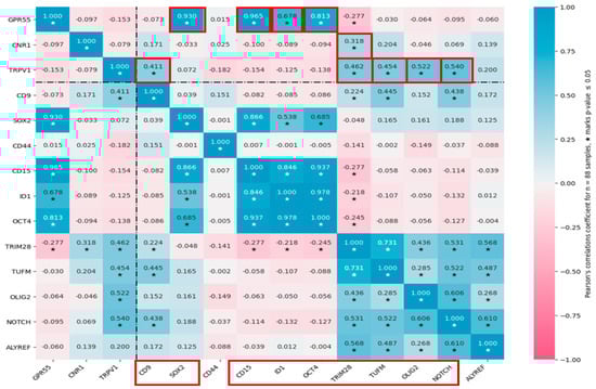 Correlations between the expressions of cannabinoid receptors and GSC markers in glioblastoma. Stemness genes are framed in red below. Correlations with cannabinoid receptors are framed in red above. GPR55 significantly correlated with the GSC markers SOX2, CD15, ID1, and OCT4. TRPV1 significantly correlated with NOTCH; OLIG2; and the putative markers CD9, TRIM28, and TUFM (the latter three of which are potential candidates to be classified as established stem cell markers [32,33,34]). CNR1 only correlated (poorly) with TRIM28. * p < 0.05.