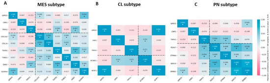 With respect to 12 biomarkers [38] related to MES, CL, and PN GBM subtypes, analysis of GBMs [35] showed no correlation to receptor expression and consequently no relation to the pathophysiology of the three GBM subtypes (Figure 5). This could be explained by high GBM intra-tumour heterogeneity, which prevents any subtype gene pattern from predominating. For example, TRPV1 correlated with the MES subtype markers DAB2 and TGFB1, CL marker ASCBG1, and the PN markers P2RX7 and STMN4. These correlations between TRPV1 and stemness genes are discussed below.
