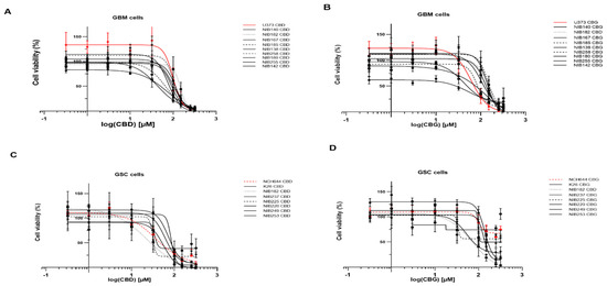 Next, we investigated the effects of CBD:CBG dissolved in base emulsion, which was designed to achieve better in vivo delivery to the tumour. We treated the primary GBM and GSC cell lines with CBD and CBG at concentrations of 0.32–320 µM as described in Methods (Table 2 and Figure 6). Both cannabinoids significantly reduced the viabilities of both GBM lines (Figure 6A,B) and GSCs (Figure 6C,D). In nine patient-derived primary GBM cell lines, CBG reduced cell viability in a concentration range of IC50 100 ± 15.3 μM. Tested on the same cell lines, CBD was not significantly more cytotoxic: IC50 78.9 ± 7.8 μM (Table 2). In eight patient-derived primary GSCs, the IC50 values were 84 ± 15.3 μM for CBG and 50 ± 7.1 μM for CBD. Furthermore, our results demonstrate that CBG and CBD reduce the viability of GBM and GSC lines in the same order of magnitude (Figure S2). These quantitative results confirm previous results on the effects of CBD and CBG (dissolved in DMSO and ethanol) on GBM and GSC cell viability [31]. When comparing IC50 values of CBD and CBG in base emulsion vs. ethanol/DMSO, we found significantly higher values when using base emulsion (Figure S3).