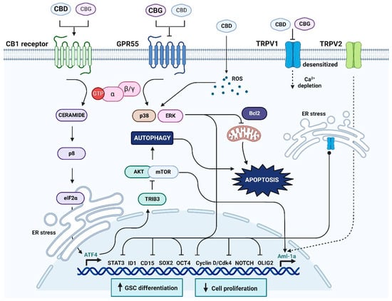 Treatment with the mixture of CBD:CBG induces two parallel mechanisms in GSCs and differentiated GBM cells. First, due to the higher GPR55 and TRPV1 expression in GSCs, the two cannabinoids bind preferentially, although with different affinities, to antagonise GPR55, desensitize TRPV1 on GSC cells, and trigger cell differentiation processes by downregulating stemness genes. This also inhibits proliferation and induces the autophagy and apoptosis of both types of glioblastoma cells. The simplified, well-known signalling pathways related to CB1, GPR55, and TRPV1 receptors upon cannabinoid binding are linked via various common intermediate markers, as follows: