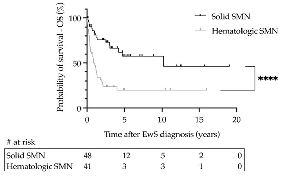 Survival of patients with primary Ewing sarcoma (EwS) and secondary malignant neoplasms (SMNs) as a function of secondary hematologic or solid malignancy in the CESS 81, CESS 86, EICESS 92, Euro-E.W.I.N.G. 99, and Ewing 2008 trials. Overall survival (OS) was calculated using the Kaplan–Meier method. **** p < 0.001. # at risk—number of patients at risk.