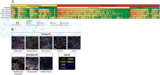 (A) Heat map identifying immune cell infiltrate densities per mm2 of CD3+, CD4+, CD8+, FoxP3+ T cells and CD20+ B-cells per AS subgroup. Each vertical bar representing an individual patient. (B) Example of Multiplex Immunohistochemistry images for all specific AS subgroups. Primary antibodies were used against CD3, CD8, FoxP3, CD20 and CD56 to detect cytotoxic, regulatory and T helper cells, B cells and Natural Killer (NK) cells. An antibody against ERG served as tumor marker.
