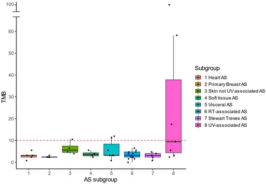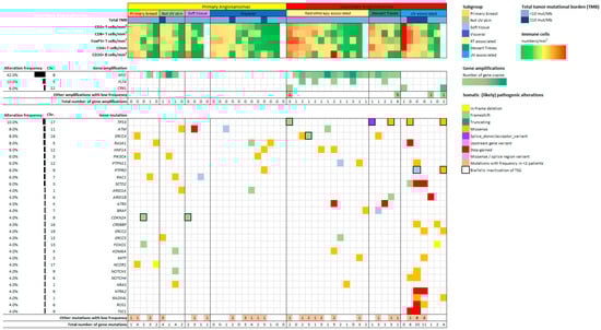 Genomic analysis was performed on tumor DNA from a subgroup of 50 patients (25 pAS and 25 sAS). Median TMB was 3.2 mut/Mb (range 0.8–11.9) in pAS vs. 3.9 mut/Mb (range 0.0–99.6) in sAS (p = 0.572). Figure 2 shows the median TMB per subgroup. TMB High (TMB-H; ≥10 mut/Mb) was found in 6 tumors (12%) divided over three subgroups, i.e., UV-AS (n = 3/7; median TMB 9.4 mut/Mb), visceral AS (n = 2/7; median TMB 3.2 mut/Mb) and primary skin AS (n = 1/4; median TMB 5.6 mut/Mb). Visceral AS with TMB-H were located in the adrenal gland and liver. None of the 50 tumors showed MSI.
