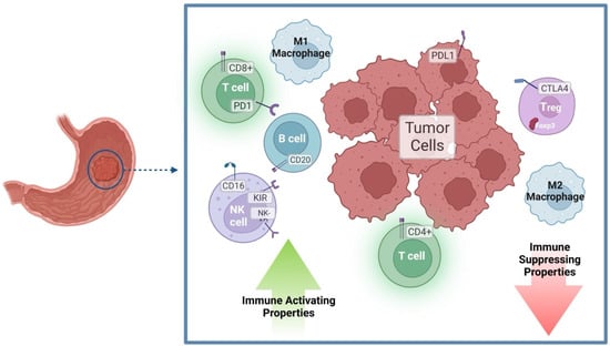 Infiltrating immune cells balance the inflammatory vs. immuno-suppressive tumor microenvironment (TME) in GC. CD8+ T cells are generally cytotoxic to tumor cells, although the tumor may evade the immune system via PD-1/PD-L-1 signaling. CD4+ T cells may differentiate into T helper subtypes with pro-inflammatory properties. However, differentiation into Treg with CTLA4 expression will drive an inhibition of immune cell activity. B cells are generally thought to have anti-tumor immune activating functions. M1 macrophages are pro-inflammatory and drive immune activation in the TME, while M2 macrophages decrease immune responses. NK cells may have anti-tumor properties which can be inhibited by tumor-secreted factors. Figure created with BioRender.com (accessed on 25 October 2022).