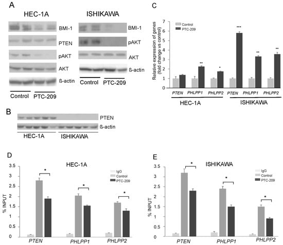The results of our previous studies showed that BMI1 silencing caused a reduction in AKT phosphorylation and increased the expression of gene coding for PHLPP1 and PHLPP2 phosphatases in endometrial cancer cells HEC-1A and breast cancer MDA-MD-23 cells []. In this study, to decrease BMI-1 protein level in HEC-1A cells and Ishikawa cells, we used the PTC-209 inhibitor, which is a potent and selective inhibitor that effectively reduces the synthesis of BMI-1 protein. The results confirmed its effectiveness because in HEC-1A and Ishikawa cells treated with PTC-209 BMI-1, the protein level was substantially reduced (Figure 1A). In both cell types treated with PTC-209, the level of AKT phosphorylation was decreased and the expressions of PHLPPs were increased (Figure 1A,B). These results are similar to results obtained previously for HEC-1A [] and Ishikawa cells (Supplemental Figure S1) treated with siRNA. In Ishikawa cells after PTC-209 treatment, the increased expression of the PTEN transcript was observed but there was no expression of PTEN at the protein level (Figure 1C). It has been shown earlier that Ishikawa cells do not possess functional PTEN protein because of deletions in the PTEN transcript deprive proper protein synthesis []. Our results also showed that there is no PTEN protein in Ishikawa cells (Figure 1C). The ChIP assay with BMI-1 specific antibodies was used to check the binding of BMI-1 to promoter regions of the PTEN, PHLPP1, and PHLPP2 in HEC-1A and Ishikawa cells (Figure 1D,E). The results showed that, in cells treated with PTC-209, the anti-BMI-1 antibody binding level was lower compared to control cells (Figure 1D,E).